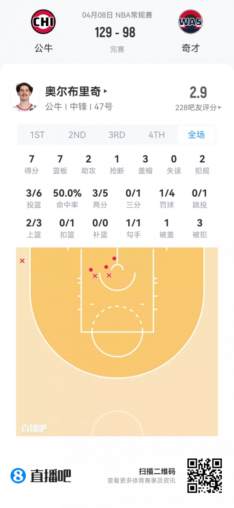 公牛次轮55号奥尔布里奇 登场21.1分钟