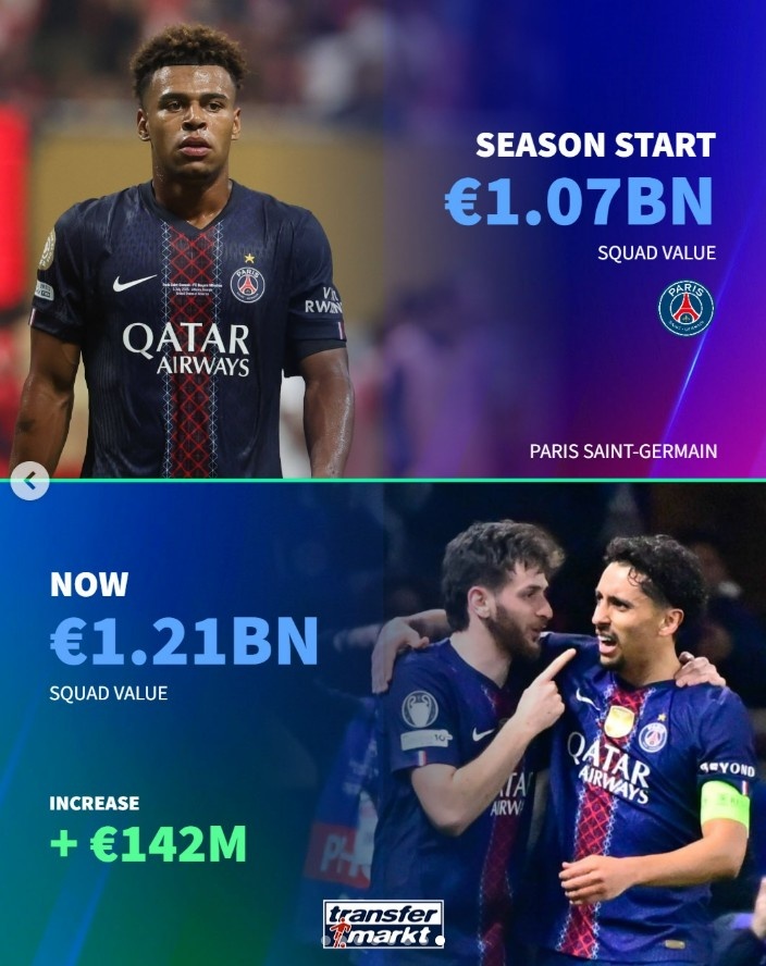 4月26日讯 德转盘点了在本赛季身价上涨最多的几支球队,其中巴黎、科莫、考文垂在列,具体如下(赛季开始身价→目前身价):